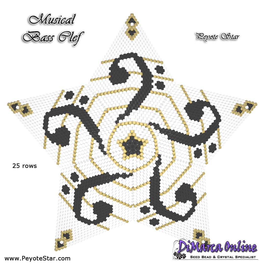 This beading pattern provides a colour diagram and word chart to create the MUSICAL BASS CLEF Peyote Star.