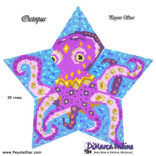 This beading pattern provides a colour diagram and word chart to create the OCTOPUS 3D Peyote Star.