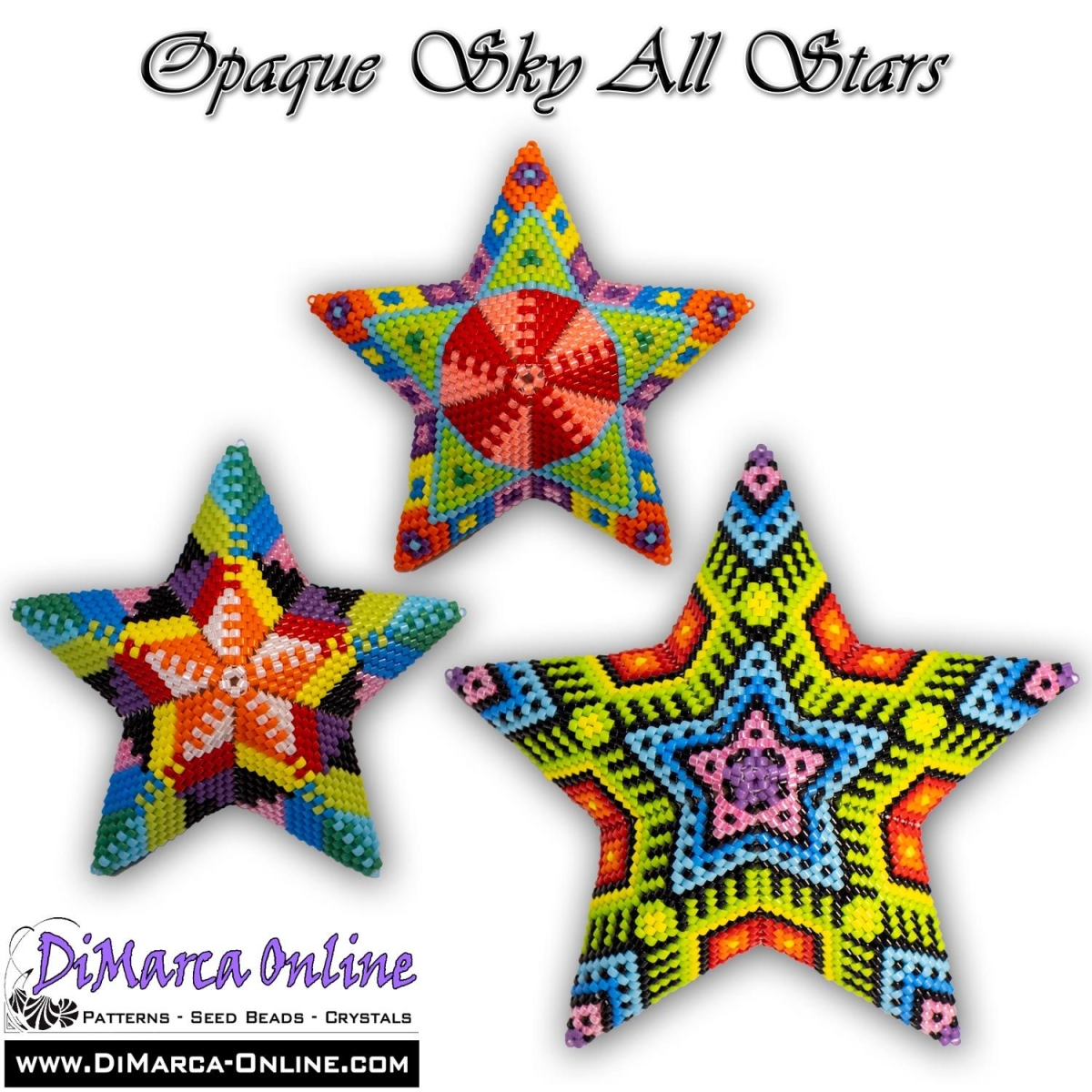 This beading pattern provides colour diagrams and word charts to create the 3 OPAQUE SKY 3D Peyote Stars: OPAQUE SKY 1, 2, and 3 Peyote Star.