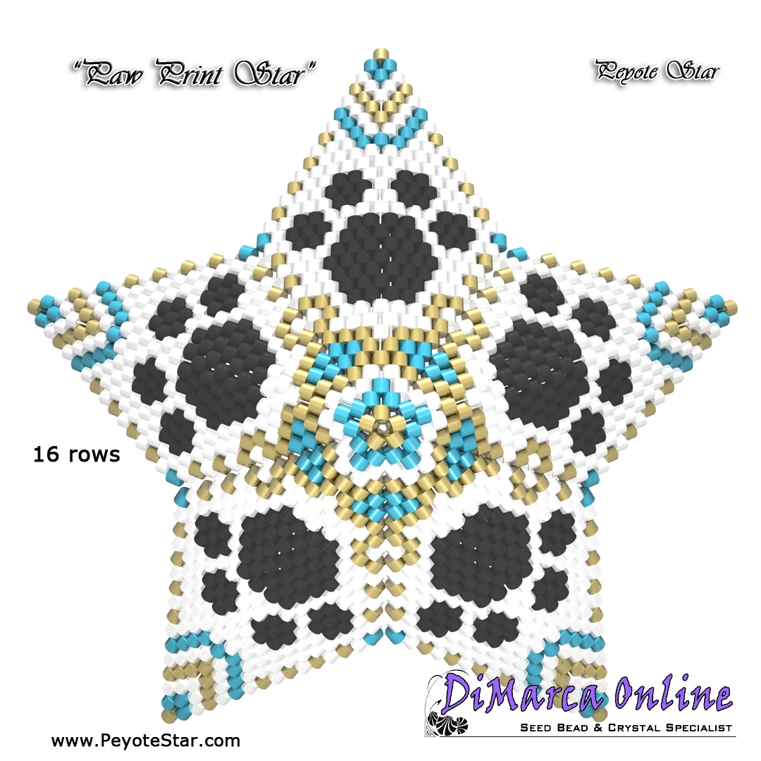 This beading pattern provides a colour diagram and word chart to create the PAW PRINT Peyote Star.
