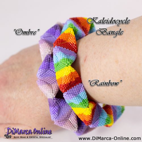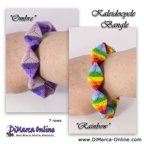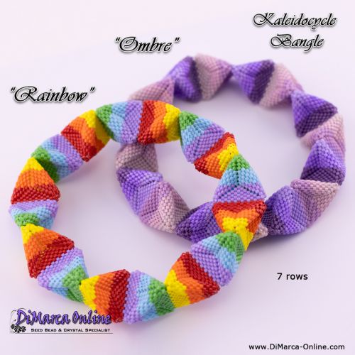 This beading pattern provides colour diagrams and word charts to create 2 KALEIDOCYCLE BANGLES: RAINBOW and OMBRE 3D Kaleidocycle Bangle.