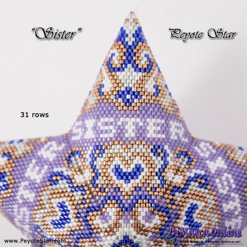This beading pattern provides a colour diagram and word chart to create the SISTER Peyote Star.