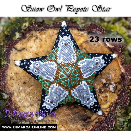 This beading pattern provides a colour diagram and word chart to create the SNOW OWL Peyote Star.
