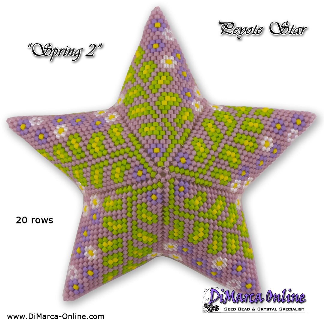 This beading pattern provides a colour diagram and word chart to create the 4 SPRING Peyote Stars: Spring 1, 2, 3 and 4.