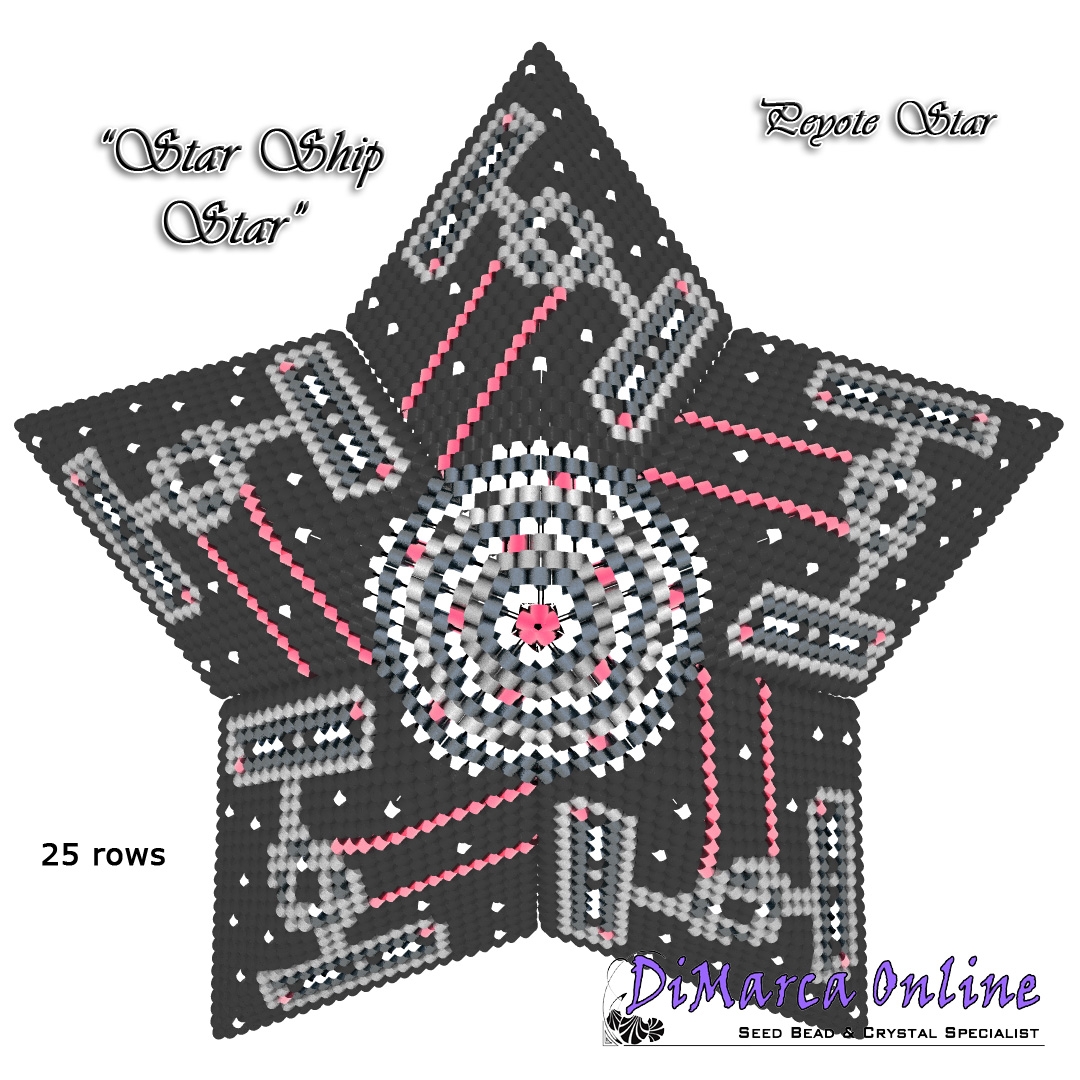 This beading pattern provides a colour diagram and word chart to create the STARSHIP 3D Peyote Star.