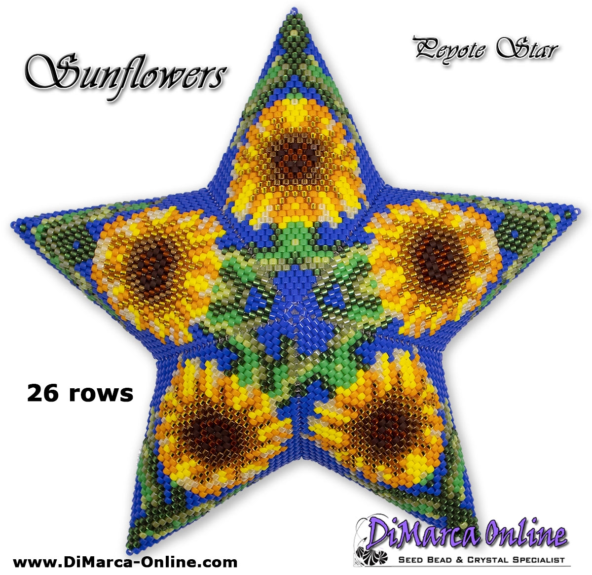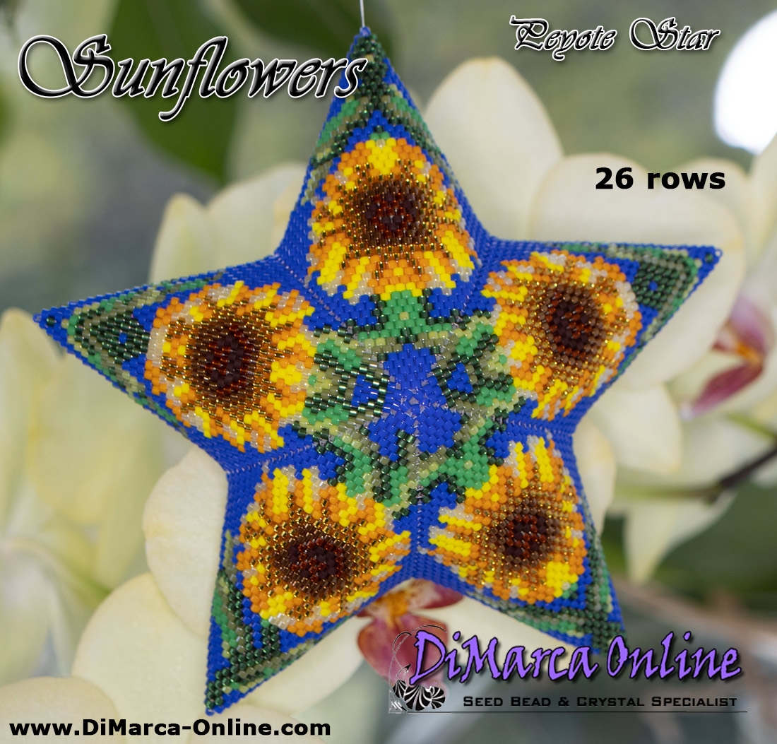 This beading pattern provides a colour diagram and word chart to create the SUNFLOWERS Peyote Star.