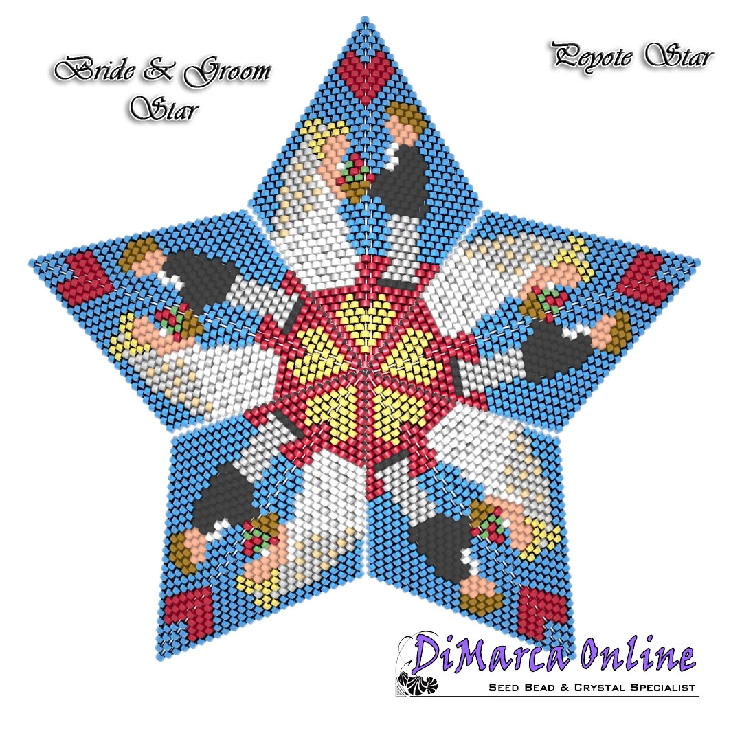 This beading pattern provides a colour diagram and text to create the 3 Wedding All Stars 3D Peyote Stars: Wedding Cake, Bride & Groom and Diamond Star.