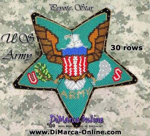 This beading pattern provides a colour diagram and word chart to create the US ARMY Peyote Star.